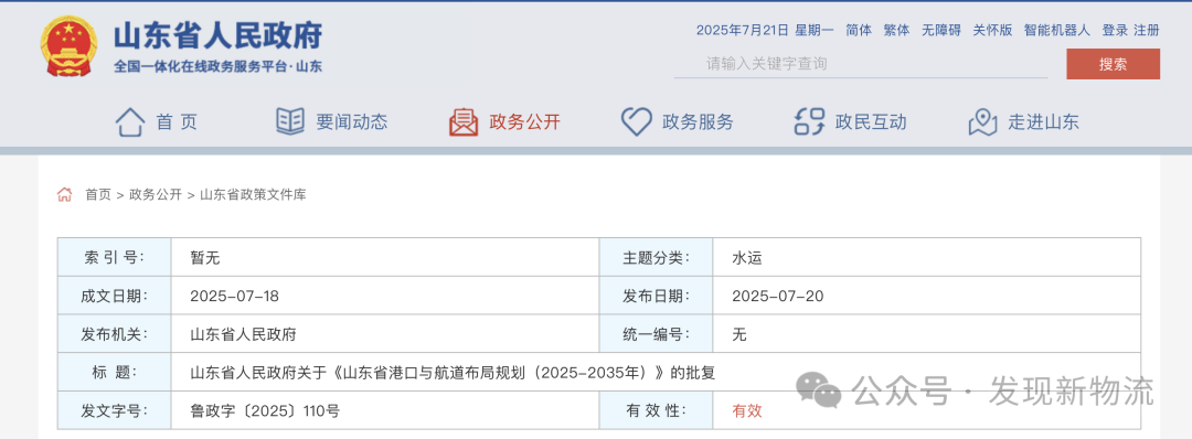 關(guān)于《山東省港口與航道布局規(guī)劃(2025-2035年)》的批復(fù)
